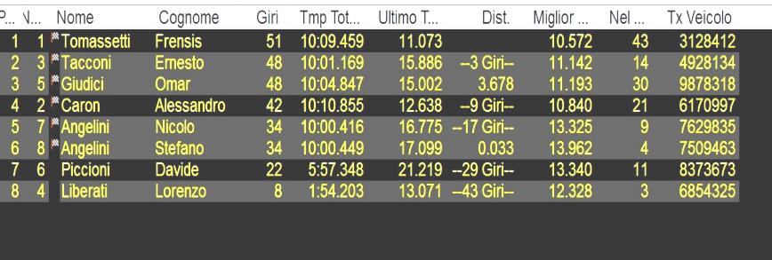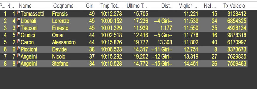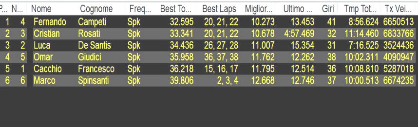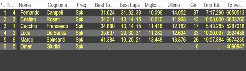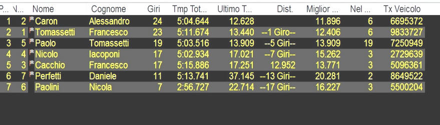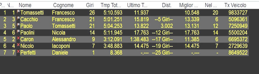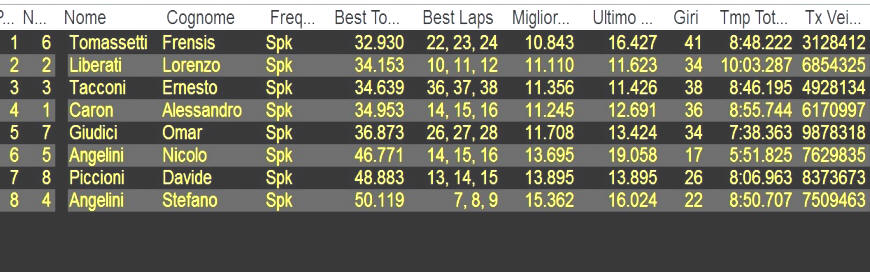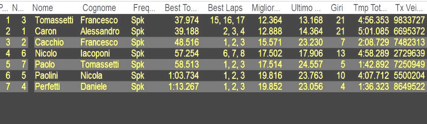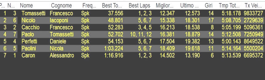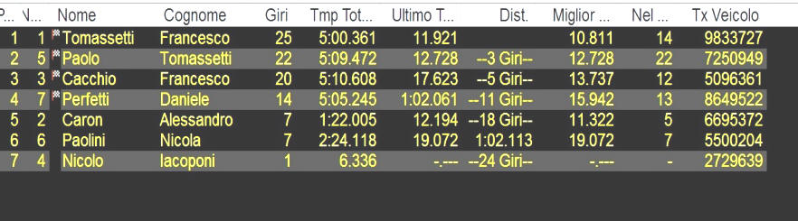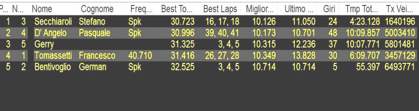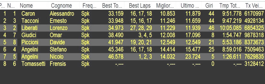 | Nome e Cognome | Giri | Giri | TOTALE | Tempi | Tempi | ||||||