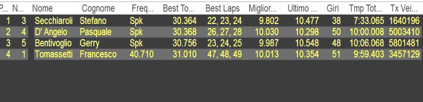 | Pilota | 1° Prova | 2° Prova | GIRI | Minuti | Secondi | Millesimi | 1° Prova | 2° Prova | |||